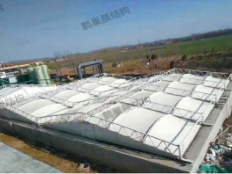 3、反吊膜 反吊膜是现在比较流行的一种加盖方式,它可针对不同污水池进行加盖,可做成随动式、固定式,圆形、拱形等多种样式。此种加盖方式不仅适应任何池体,同时还有极强的抗腐蚀性,使用年限长达15年之久。若是想长期运营,建议选择反吊膜加盖方式。