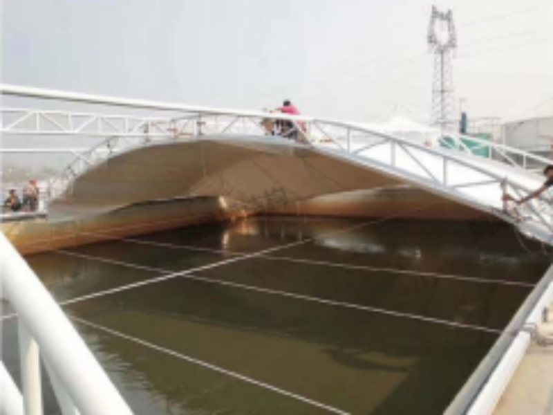 3、反吊膜 反吊膜是现在比较流行的一种加盖方式,它可针对不同污水池进行加盖,可做成随动式、固定式,圆形、拱形等多种样式。此种加盖方式不仅适应任何池体,同时还有极强的抗腐蚀性,使用年限长达15年之久。若是想长期运营,建议选择反吊膜加盖方式。