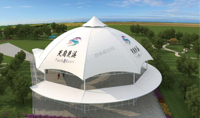 3、外形美观优雅:膜结构以其变化多端的造型,突破纯系发展形式。简练,明快,力与美的连络,给人耳目一新的感受,同时为设计师供应了更大的设想和创作发掘空间。