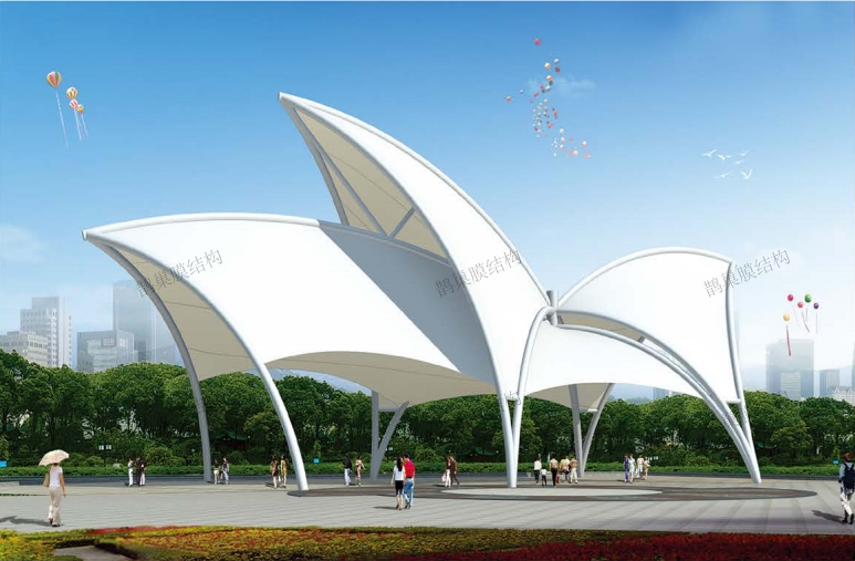 3、外形美观优雅:膜结构以其变化多端的造型,突破纯系发展形式。简练,明快,力与美的连络,给人耳目一新的感受,同时为设计师供应了更大的设想和创作发掘空间。