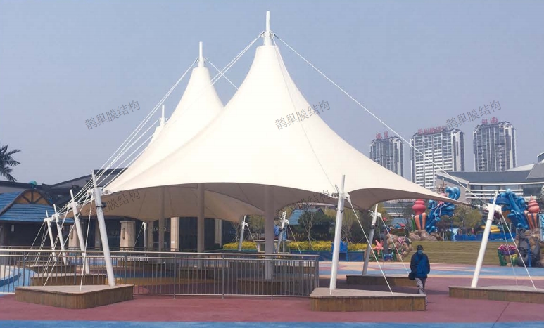 3、外形美观优雅:膜结构以其变化多端的造型,突破纯系发展形式。简练,明快,力与美的连络,给人耳目一新的感受,同时为设计师供应了更大的设想和创作发掘空间。