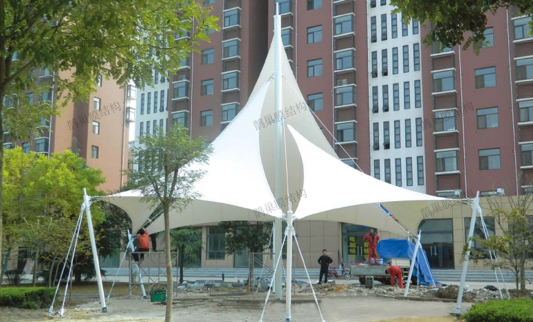3、外形美观优雅:膜结构以其变化多端的造型,突破纯系发展形式。简练,明快,力与美的连络,给人耳目一新的感受,同时为设计师供应了更大的设想和创作发掘空间。